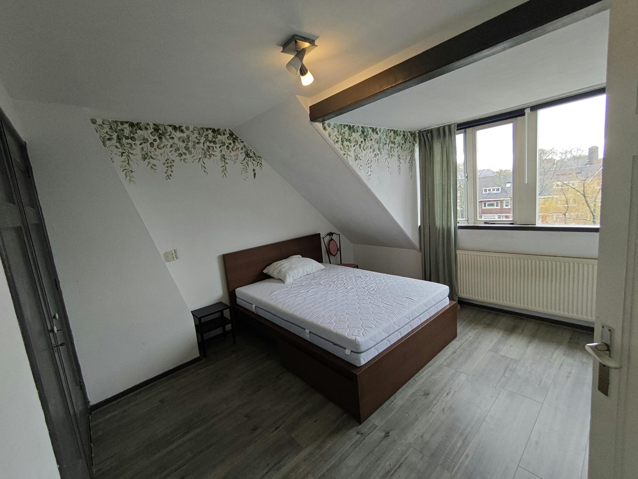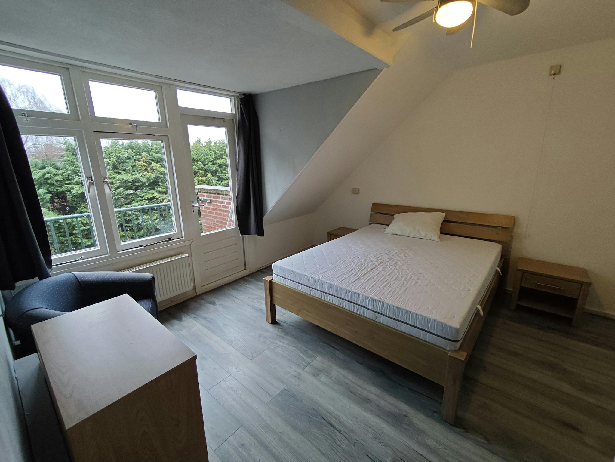 4 bedrooms, all furnished, a large living room and a dining room. Located at a nice avenue with view over the watersite. Local shops as well as beautiful parks and the Maas river are just a short walk away. The apartment has a bathroom with shower and kitchen, and a very large living room with a large balcony. Public parking in front of the apartment. You can put your bikes in the 4m2 private shed which comes with this apartment. This apartment would be very suitable for a 4 persons household or shared housing for 3 or 4 young professionals.