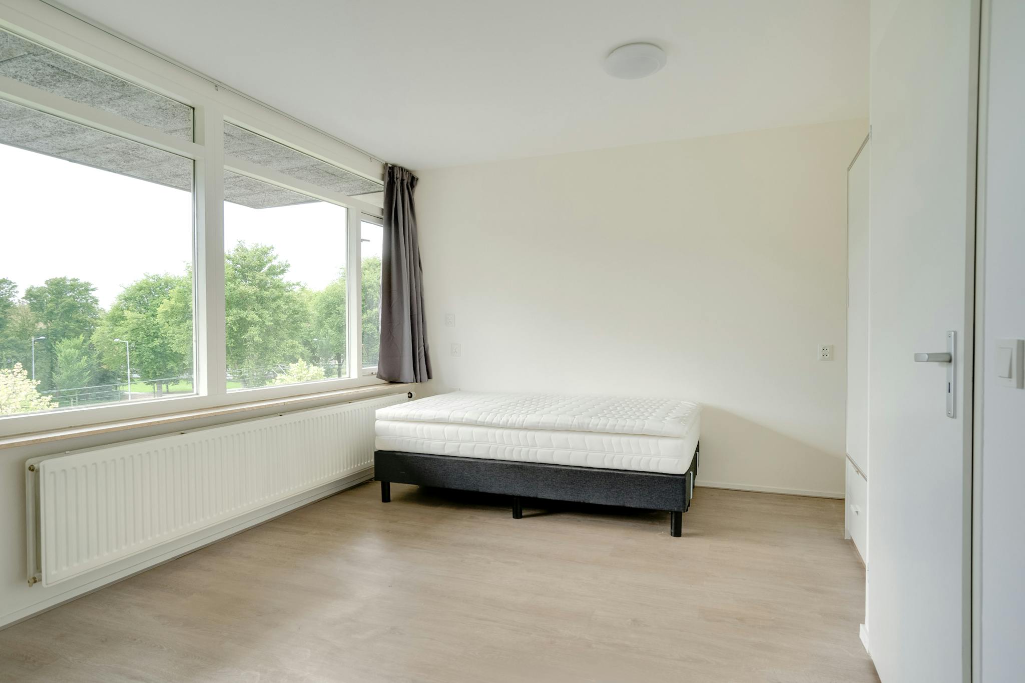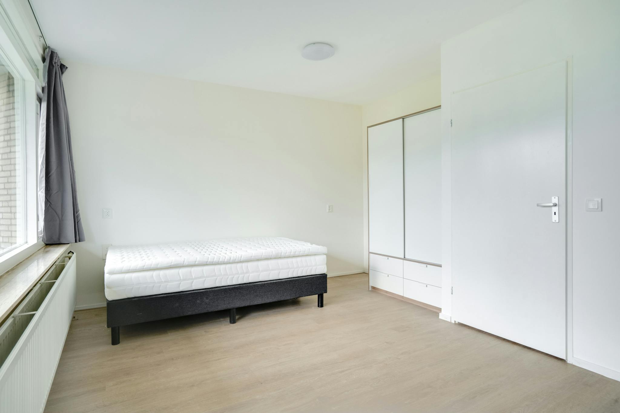 The bedroom is furnished with a new bed, matrass, desk, wardrobe, and chair.