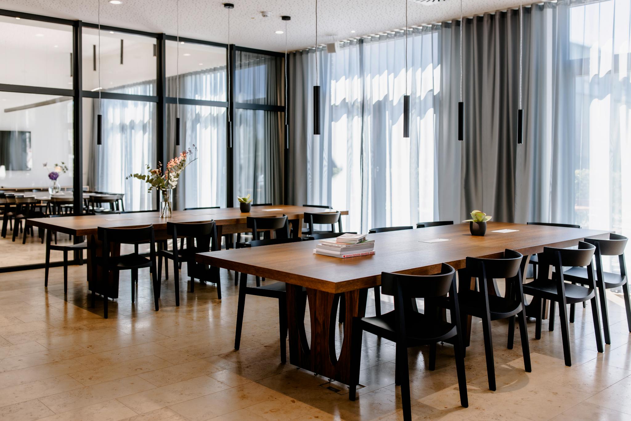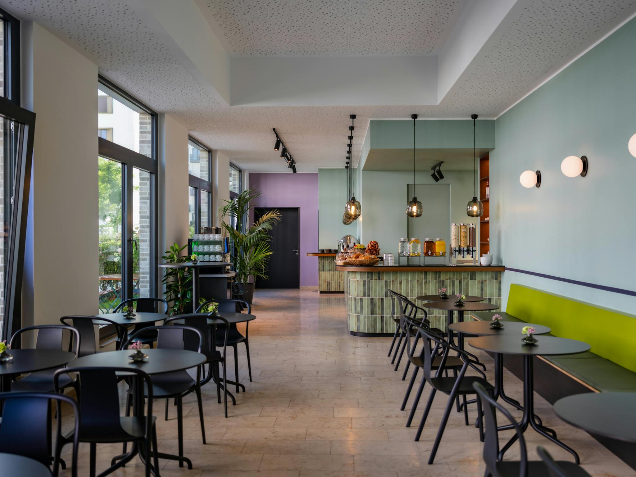 • Green inner courtyard with seating and fountain