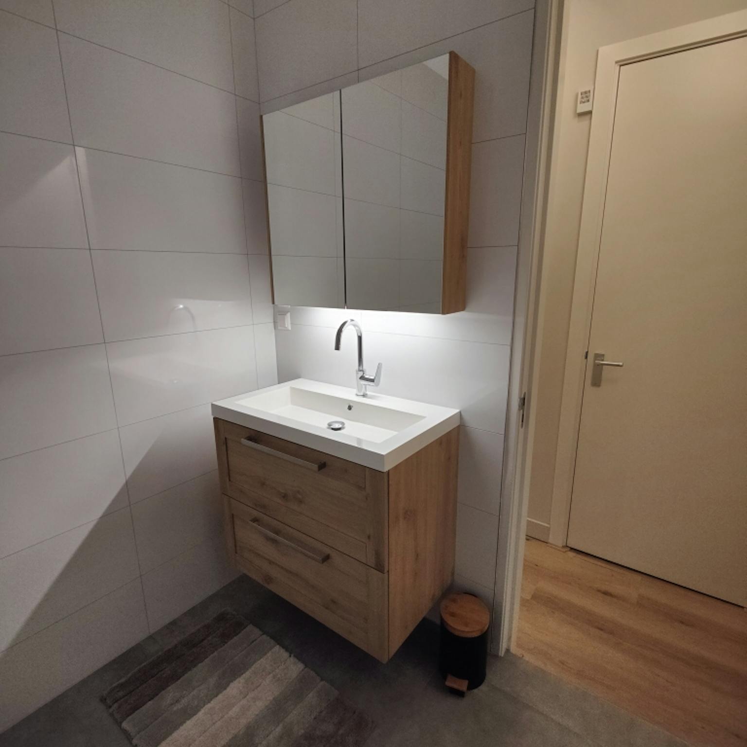The bathroom is near the bedroom and is fully equipped as well. With a standing shower, toilet, sink and mirror with storage space, this bathroom really has all you need.
