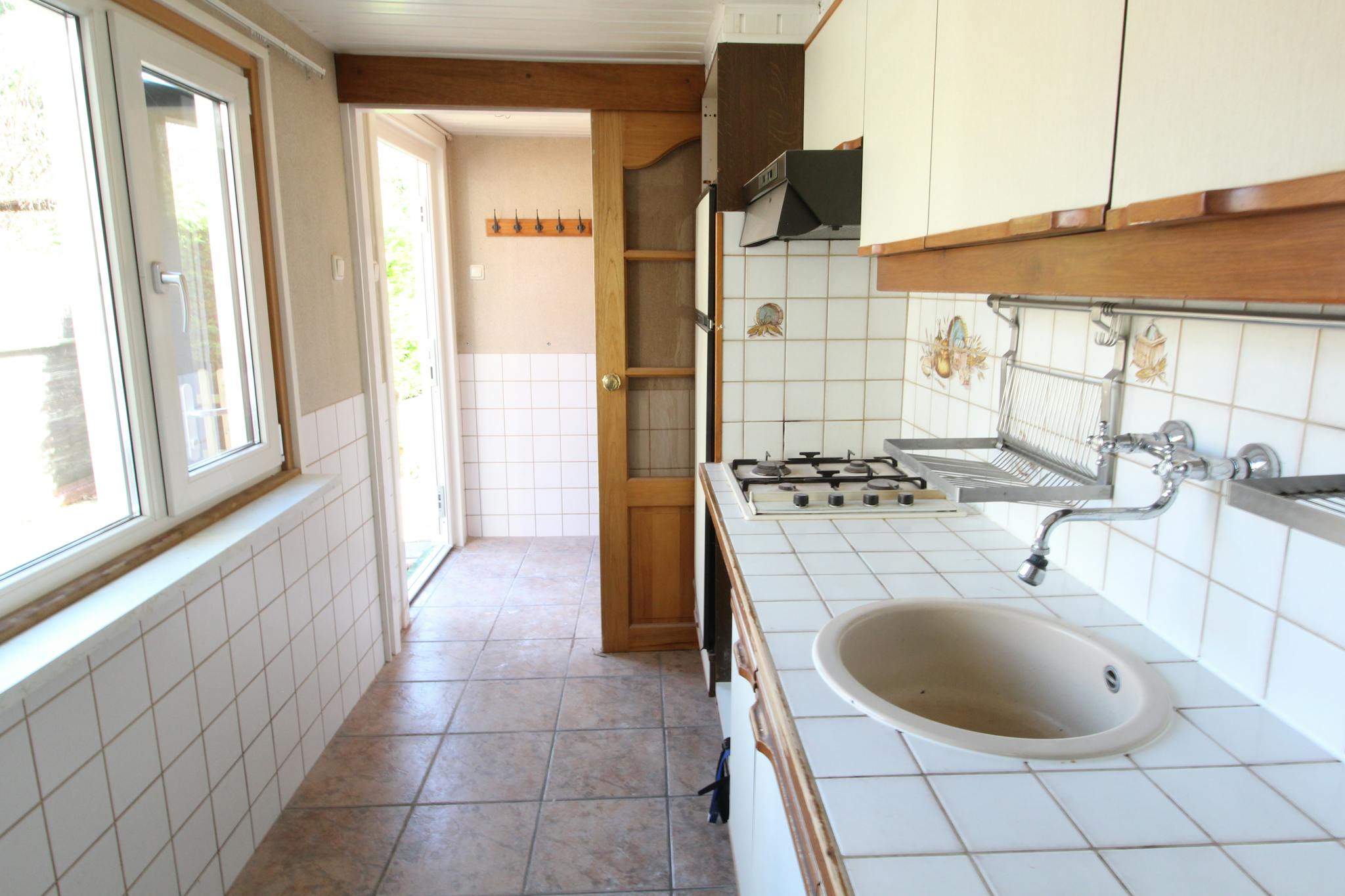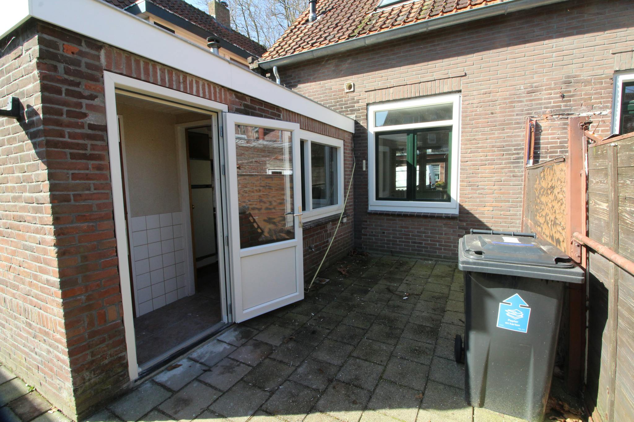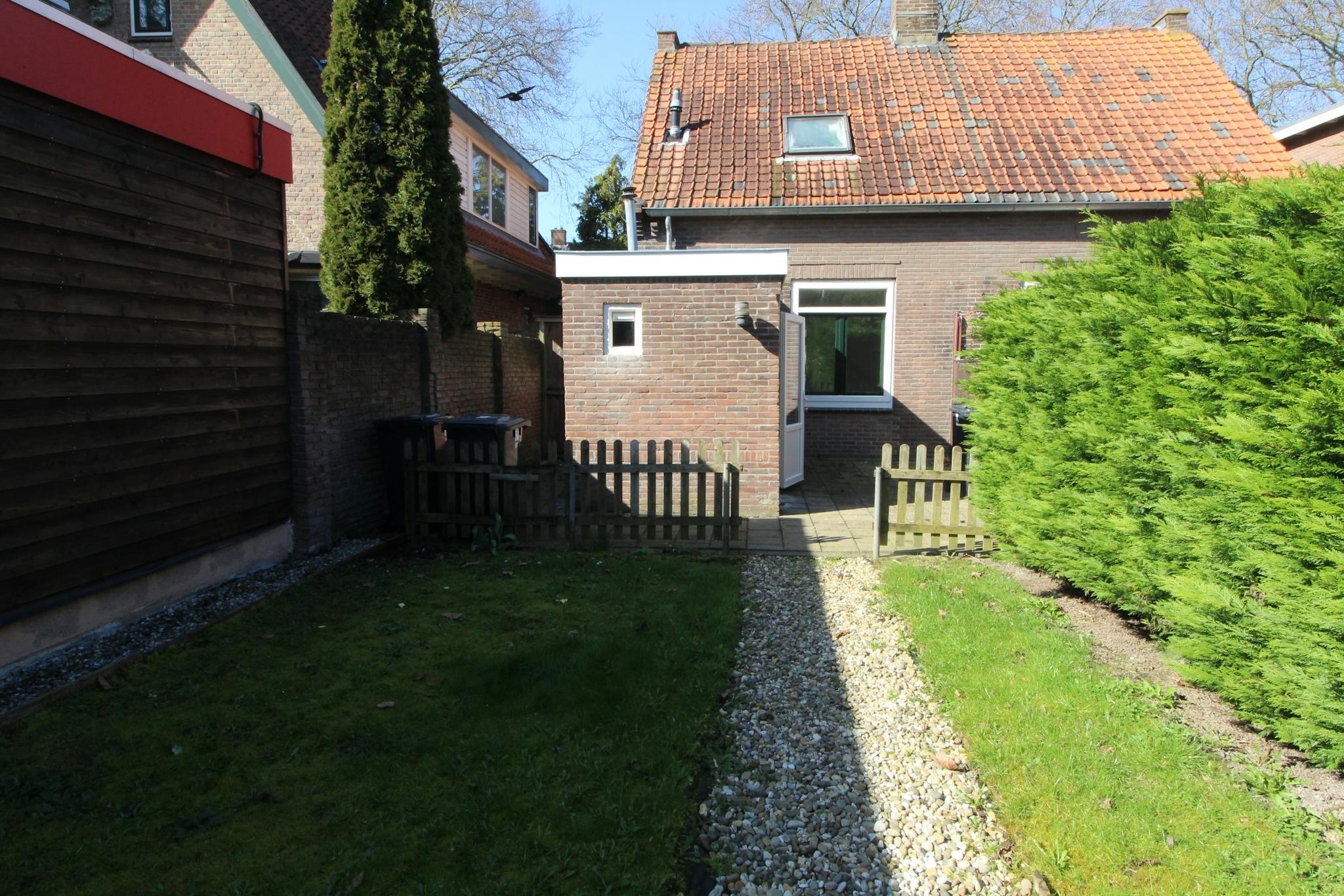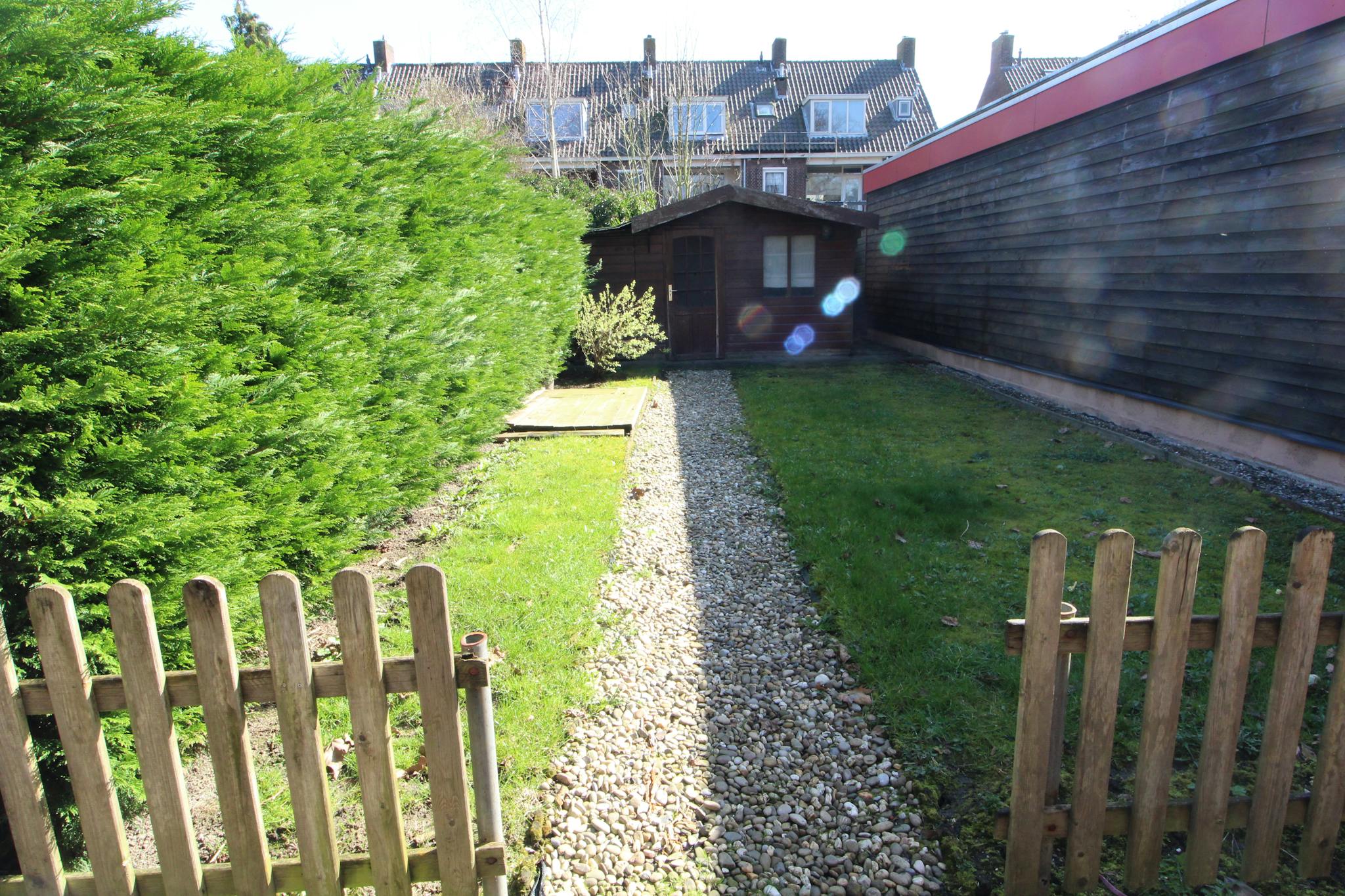The house features both a front garden and a private back garden with a shed. Inside, you will find a bright and spacious living room with windows on both sides, allowing plenty of natural light. The property also includes a bathroom and a kitchen equipped with appliances.