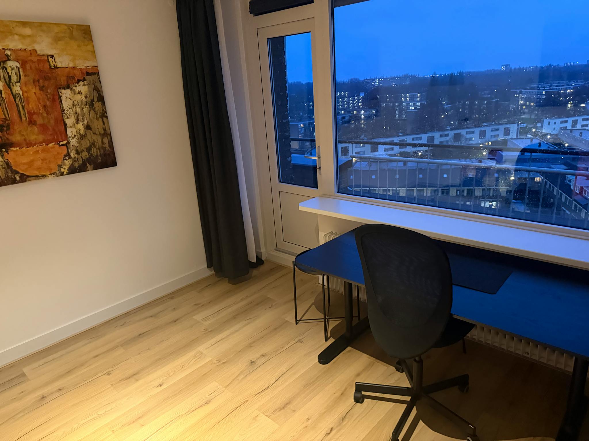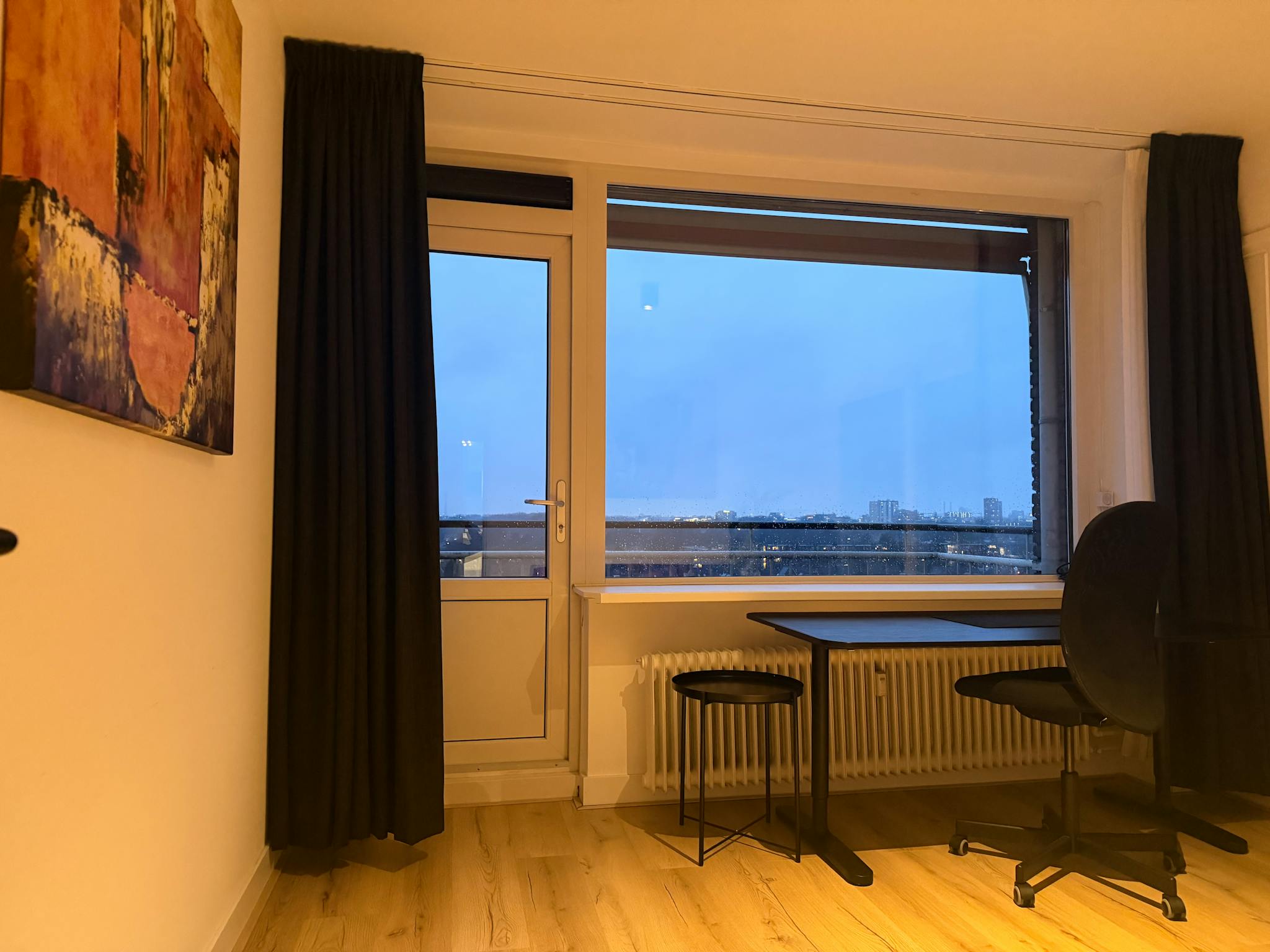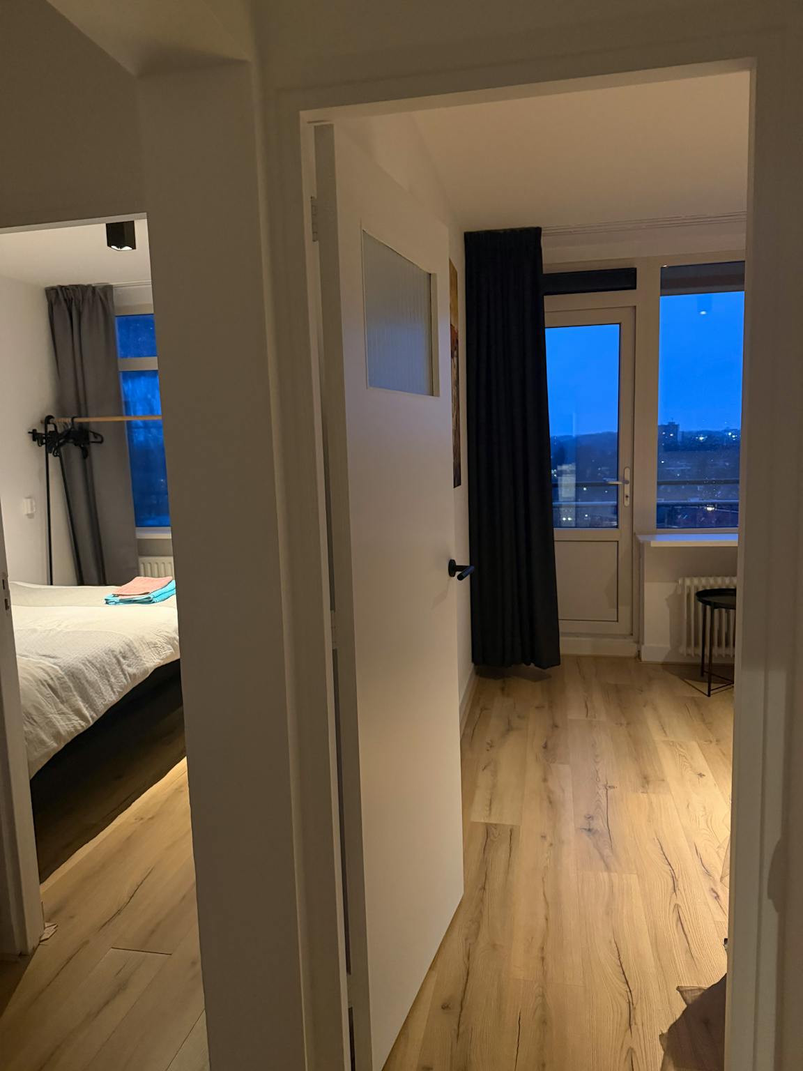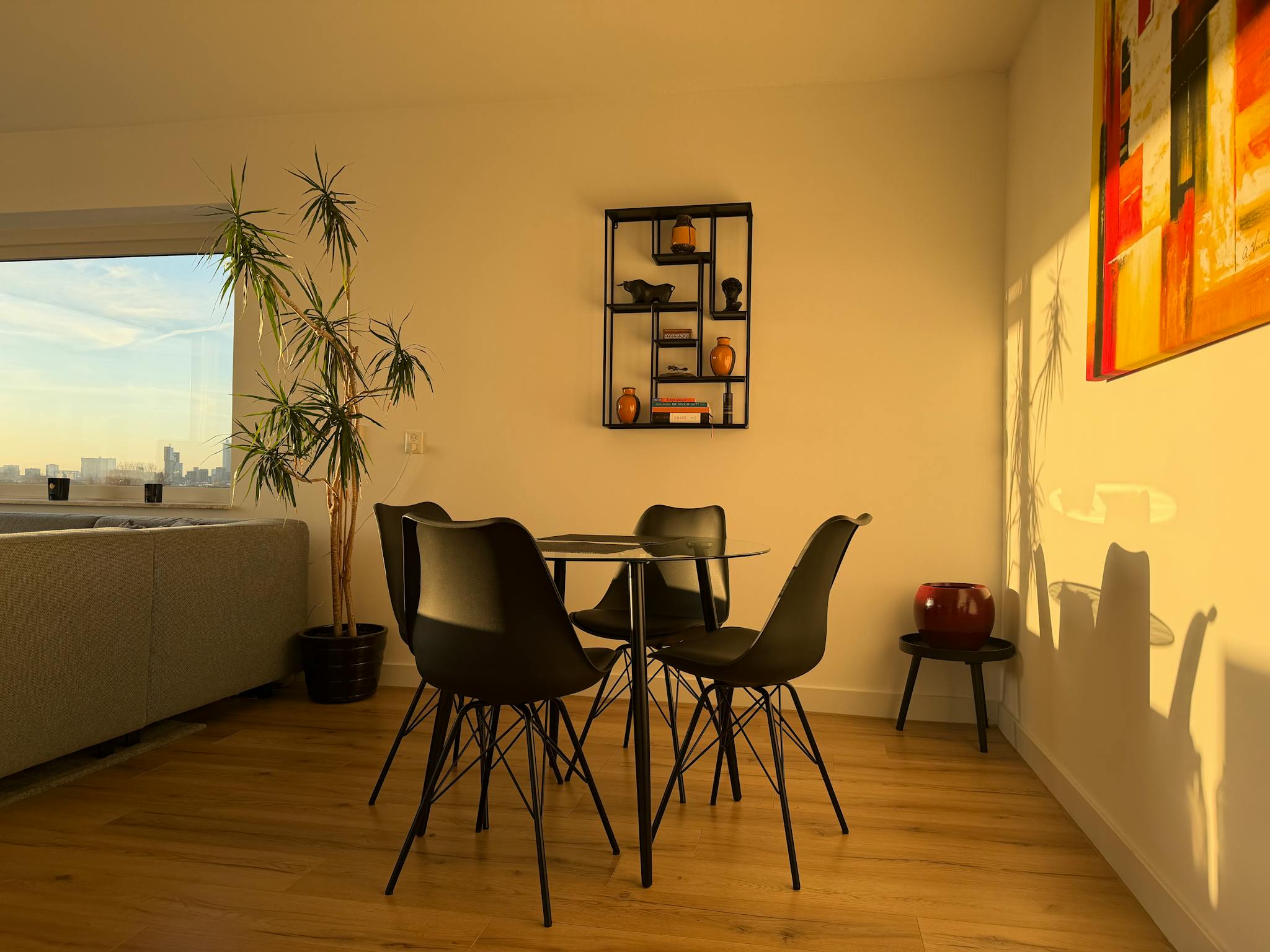 Welcome to my peaceful top-floor penthouse, tucked away in the corner for extra privacy. From here, you’ll have amazing panoramic views of Rotterdam’s skyline, Ahoy, the Euromast, and a full view of Feyenoord Stadium—especially beautiful when the stadium lights up on match nights.