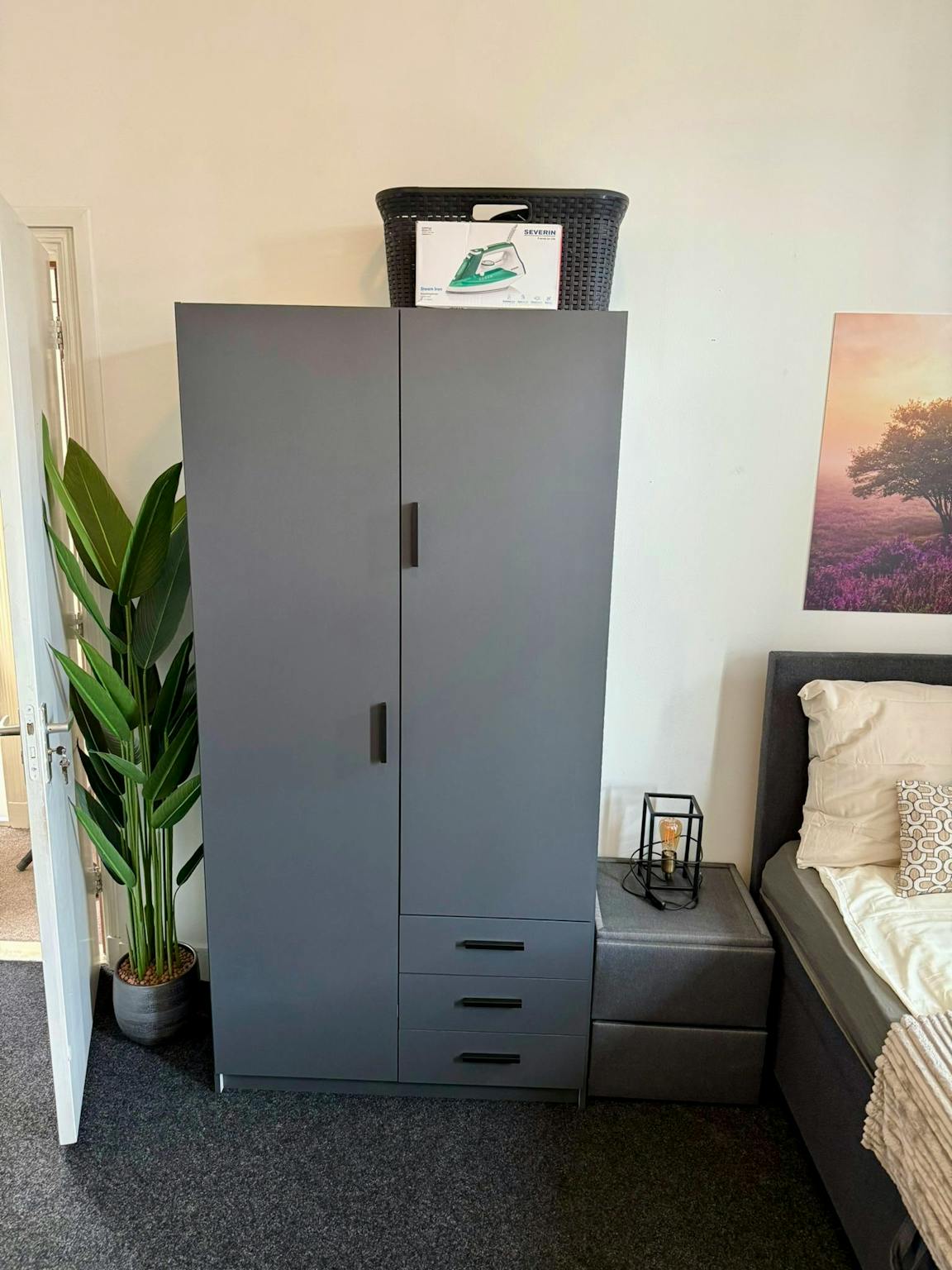 - Ample storage space with a modern wardrobe, drawers, and shelving