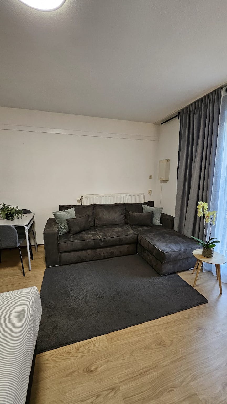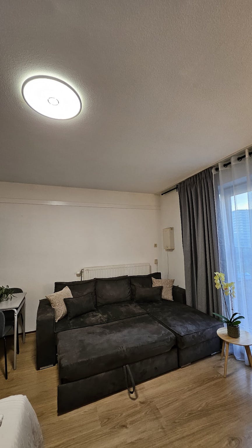 The apartment offers a bright and comfortable living space with room to relax, work, and sleep. Its practical layout makes it easy to enjoy both comfort and convenience in one modern studio-style home. Bed size is 120x210 cm. The couch is with sleeping and folding function (can be converted into a double bed).