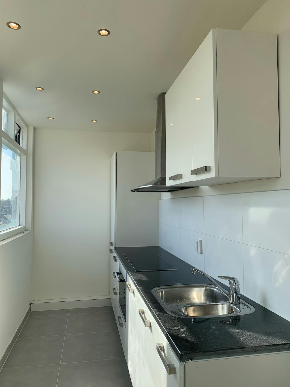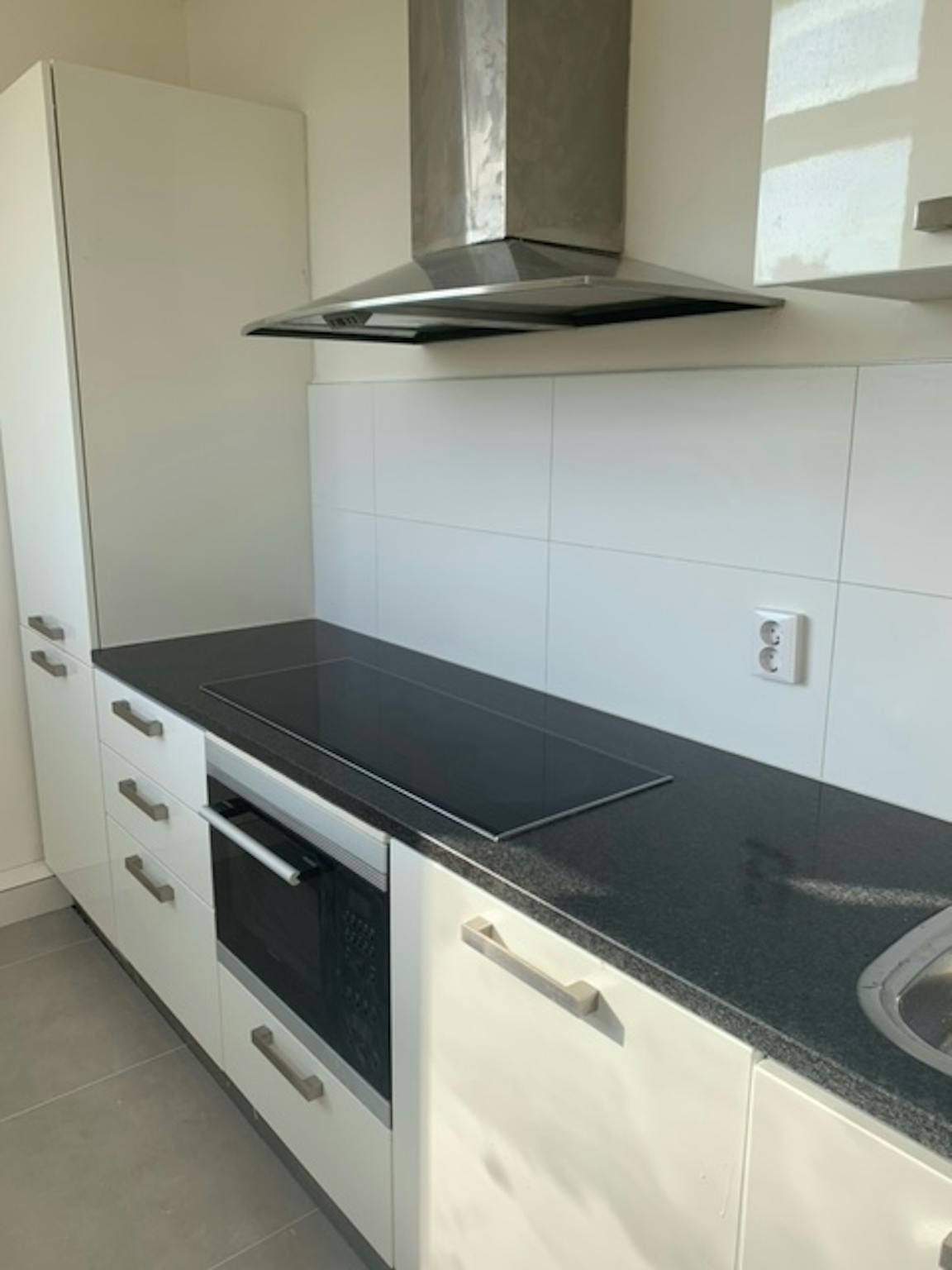 Entrance. Hall with toilet (to be renovated with hanging toilet), stairs to the 4th floor and access to the living room and bedroom 1. The cozy living room has a neat laminate floor, half open kitchen and access to the balcony. The kitchen has all appliances such as a 5-burner induction hob with extractor hood, combi oven, dishwasher, fridge and freezer and induction. The balcony is approximately 4 m2 and located on the southwest.