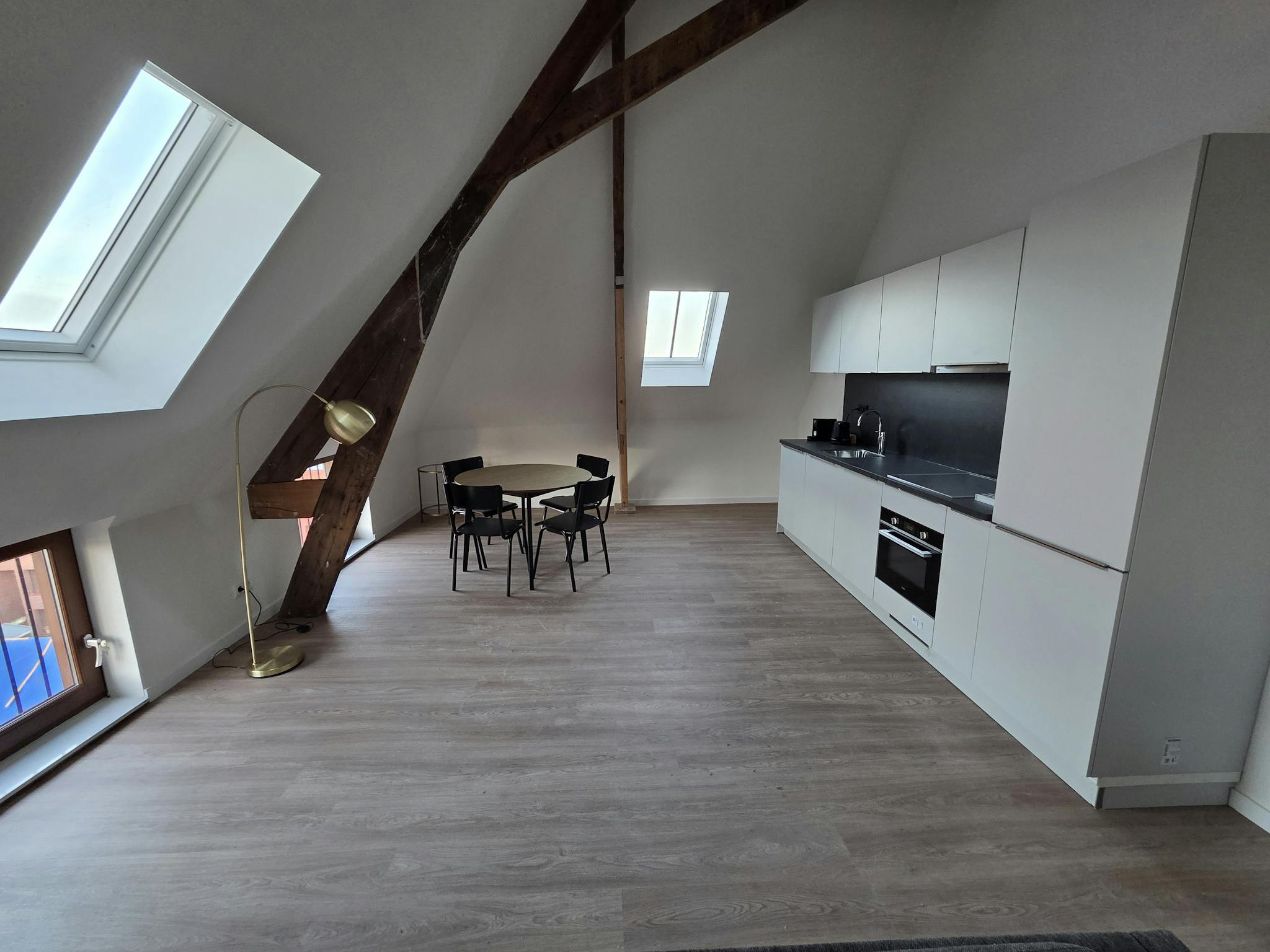 - Een sfeervolle woonkamer met open keuken, voorzien van o.a. een combimagnetron, koelkast en vaatwasser