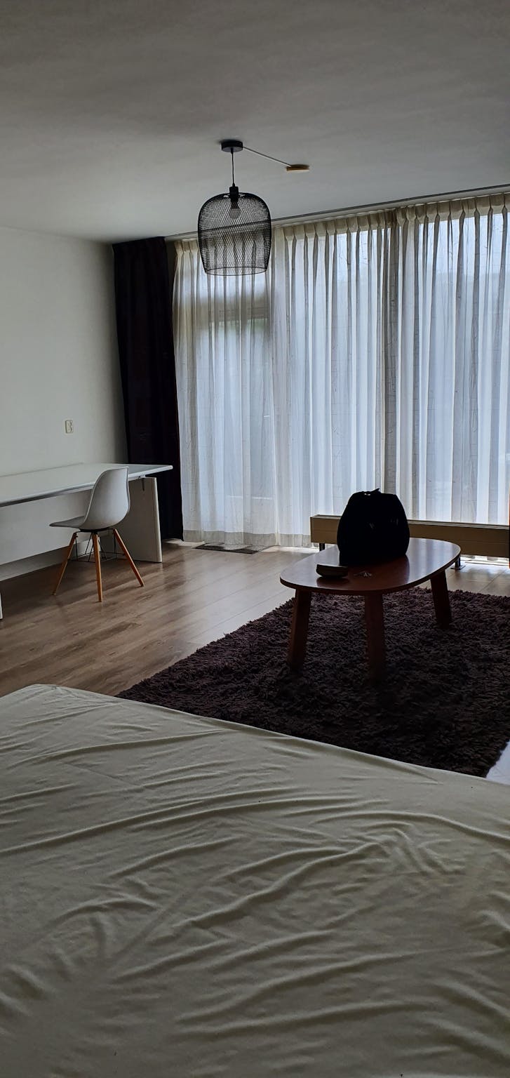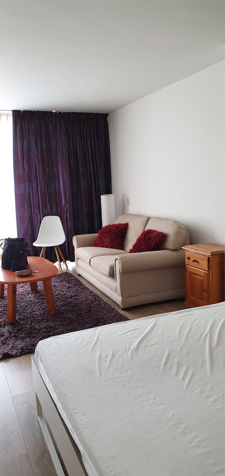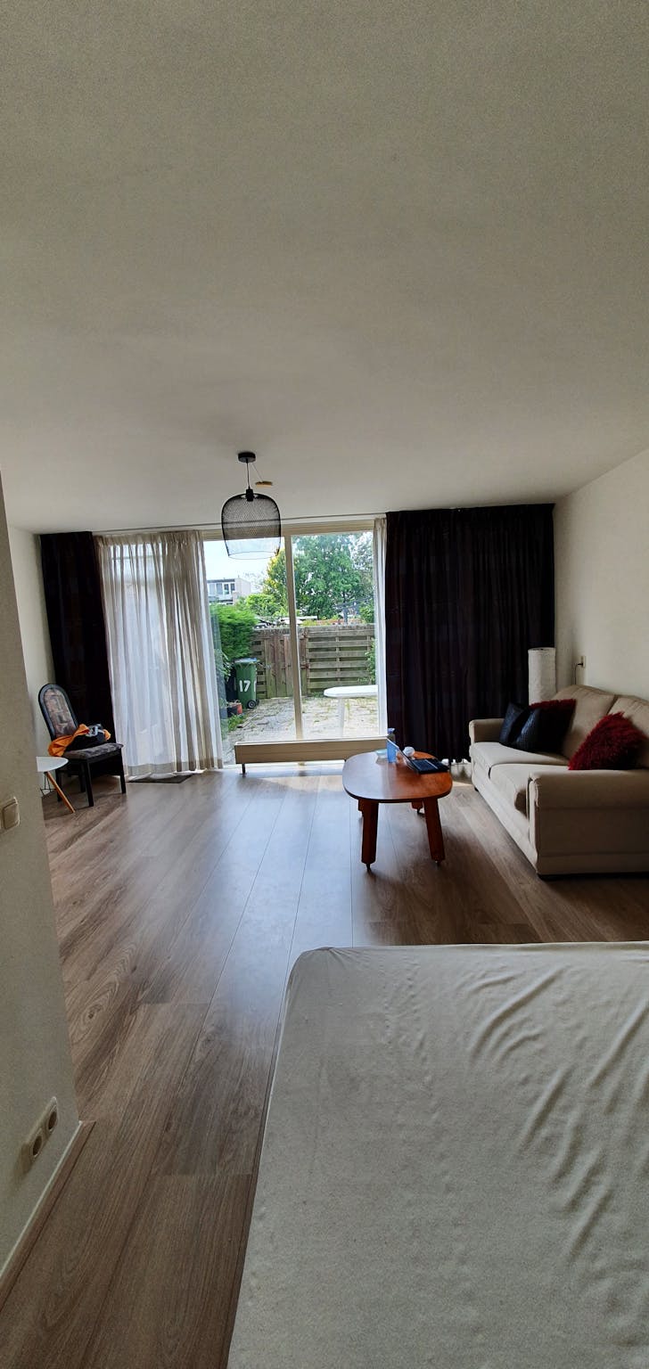 The house has 3 floors. On the ground floor, main entrance, garage, toilet and one bedroom with access to the garden. On the first floor, one bedroom , common area with open modern kitchen equipped with build-in dishwasher, gas stove with 5 burners, oven, microwave and refrigerator. On the second floor, bathroom with bath and shower. Second toilet and two bedrooms. There are also washing machine and dryer in the garage. House is located on the outskirts of Amsterdam. Supermarkets, all kinds of shops, restaurants and bars are all within walking distance. You can register at the city hall. Refundable deposit is required. (hidden email)