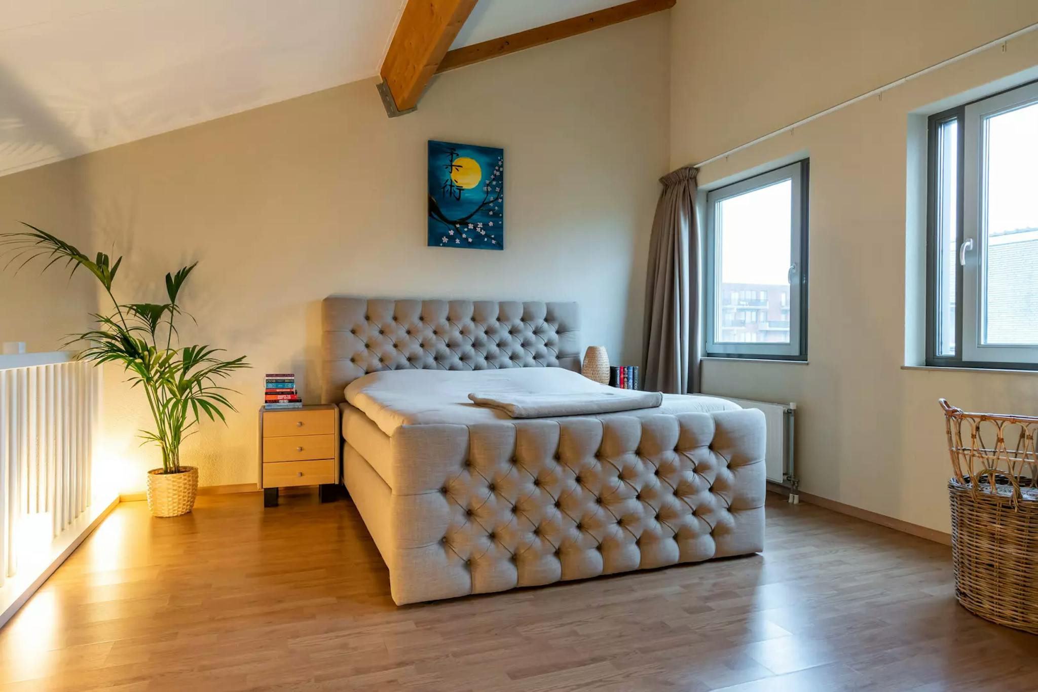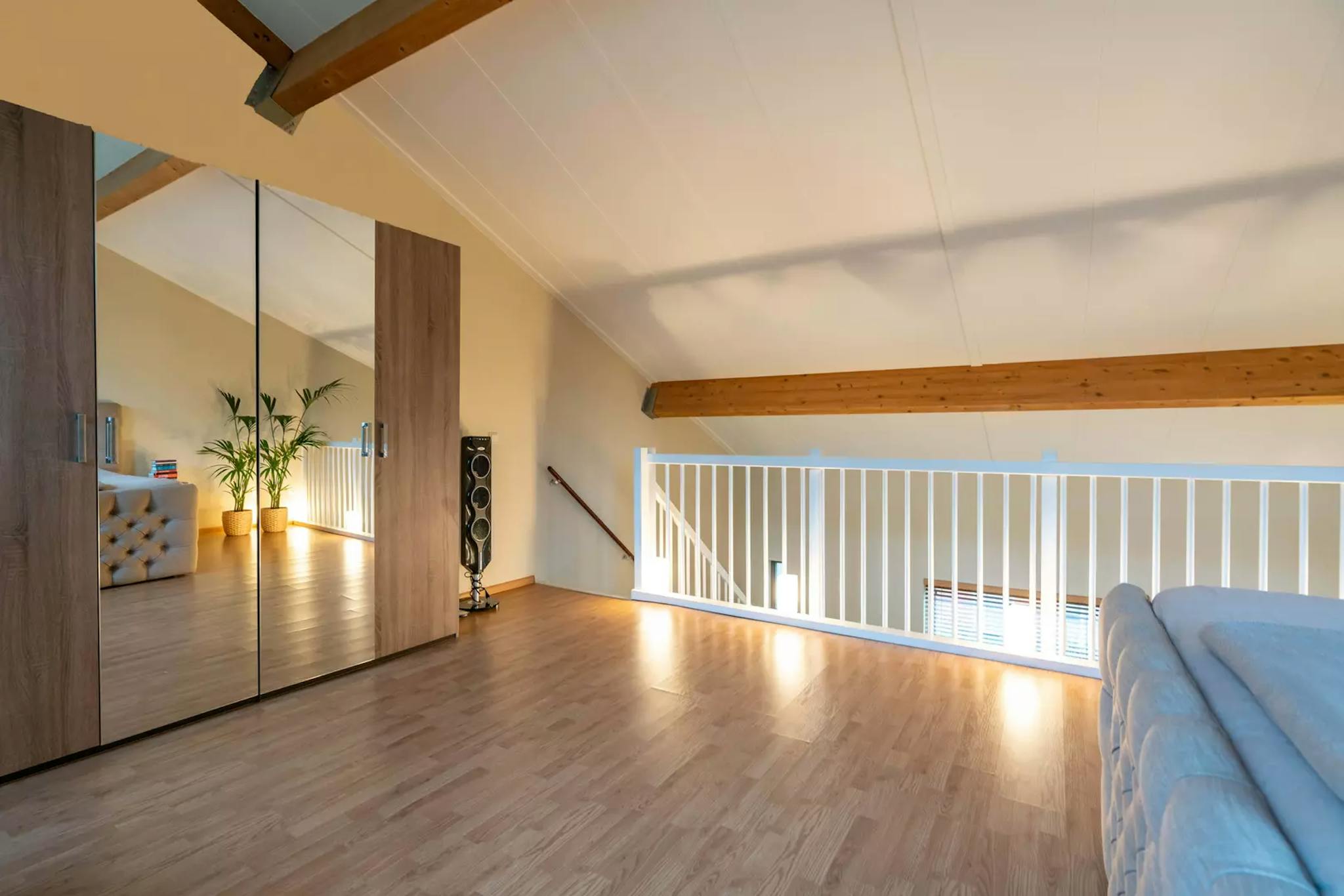 De riante vide met balustrade is in gebruik als ruime en lichte slaapkamer maar is nog vrij in deelbaar. Hier kunnen met gemak twee ruime kamers ontstaan en tevens een handige vliering voor extra bergruimte.