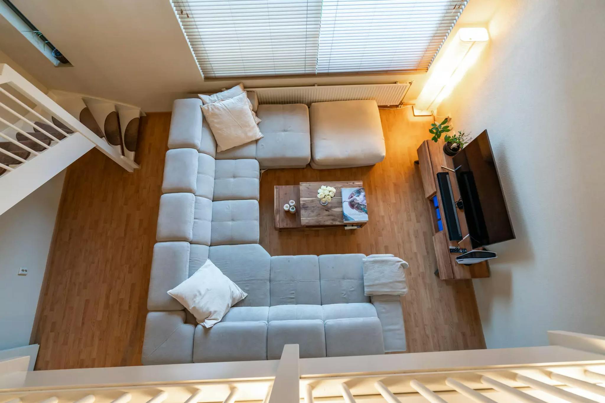 2nd floor: The spacious loft with balustrade is used as a spacious and bright bedroom, but is still freely divisible. Two spacious rooms can easily be created here, as well as a handy loft for extra storage space. There is a shared storage room under the concrete stairs on the side of the building. So if you are looking for an ideal (starter) rental home that you can move into right away, but which differs considerably from a standard apartment due to its layout, then you should come and see this playful maisonette.
